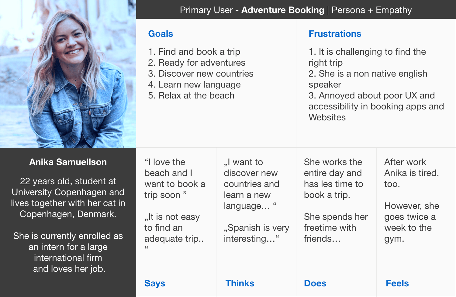 2. Anika Samuellson is a marketing intern for a large international firm who needs an easy way to book a trip at her own pace without the pressure of booking face to face like at a booking agency and wants to see ratings, because she is a non native english speaker – needs time to translate and understand the booking options and rely on user ratings for hotels.