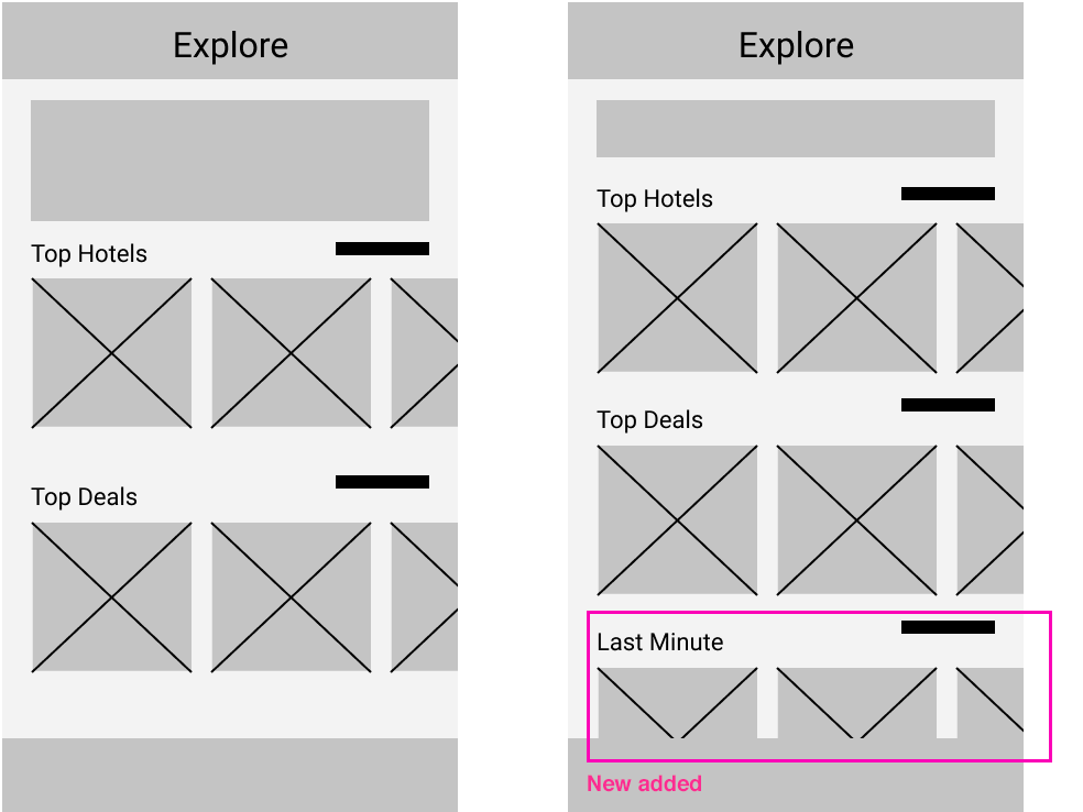 Wireframe low fidelity: At this screen the user can discover top hotels and top deals. UX Research showed that users are interested in last minute offers. That is why, I have added the section last minute to the wireframe.