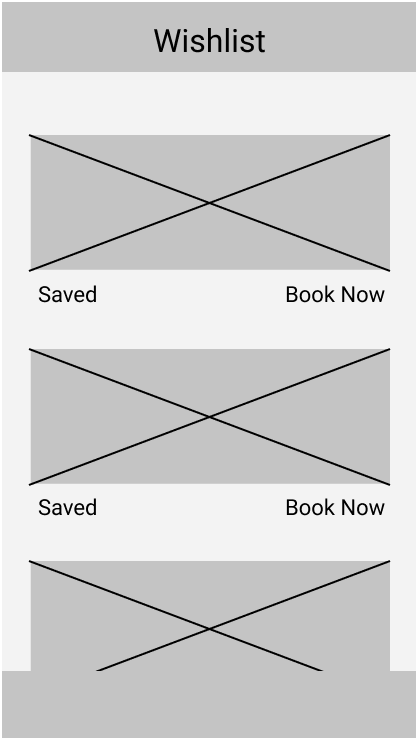 Wireframe low fidelity: This page shows the Wishlist. All saved trips are placed here.