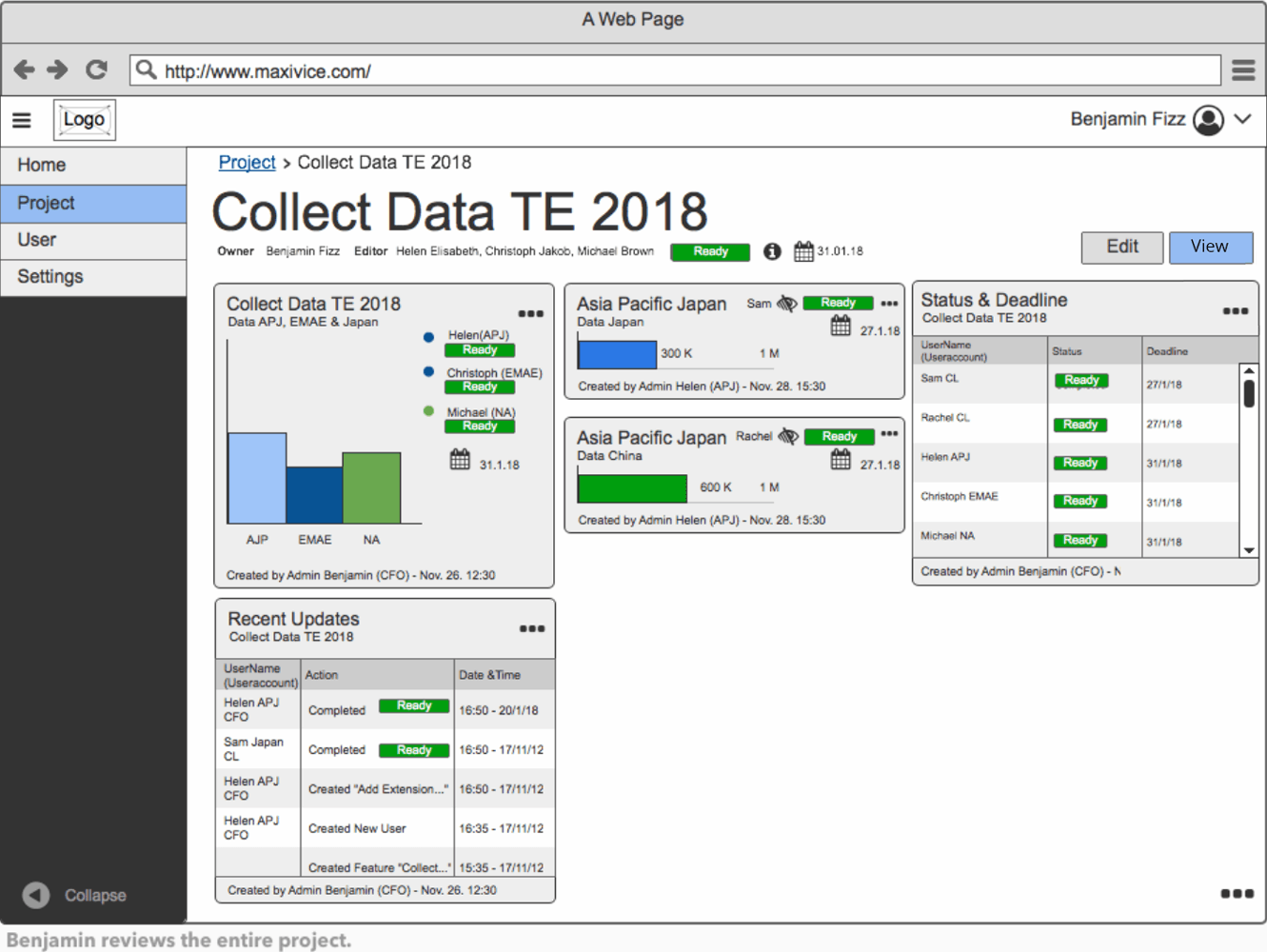 SAP UX Design challenge: November 2017: Benjamin, the CFO of MAXIVICE a global producer of sporting fashion & accessories, is asked to prepare the budget for 2018. As one of the biggest contributor to theexpenses are travel costs, he needs to know the estimated travel expenses for the company for 2018. He starts a workflow to collect this data from the financial leaders of the different regions (APJ, EMEA & NA). As a reference Benjamin sends the actual travel expenses of 2017 along. He needs the data by 31st of January 2018, to report them to Henry, the CEO of MAXIVICE. The financial leaders of the regions distribute the work to the leaders of the countries, but change the deadline to 27th of January to have enough time to review the data, before sending it to Benjamin. Benjamin and the region leaders can monitor the progress of the task, who is involved, time frames, completion rate, status… etc. at any time.