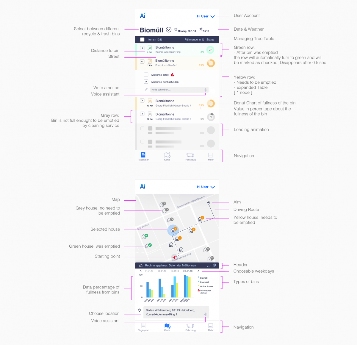 User Interface Design of Town Cleaning App. The first image shows the task-manager with realtime data from bins presented in tables. The second user interface shows the design concept of intelligent routes and accounting planner with Charts, Text Input and Map.